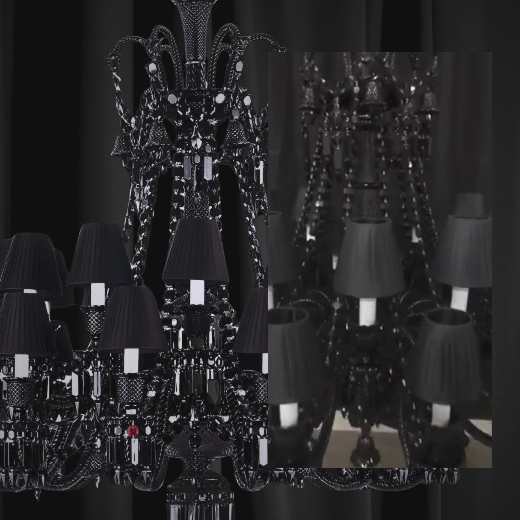 Chandelier of Twist bends the expected, spiraling midnight crystal into a movement that feels both deliberate and untamed. Its single crimson accent is not decoration but declaration — a mark of tension, of temptation restrained.